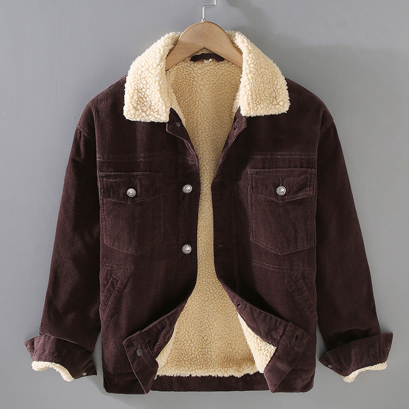 Men's Corduroy Workwear American Retro Lapels Jacket Heavy Imitation Lamb Wool Thickened Cotton-padded Coat
